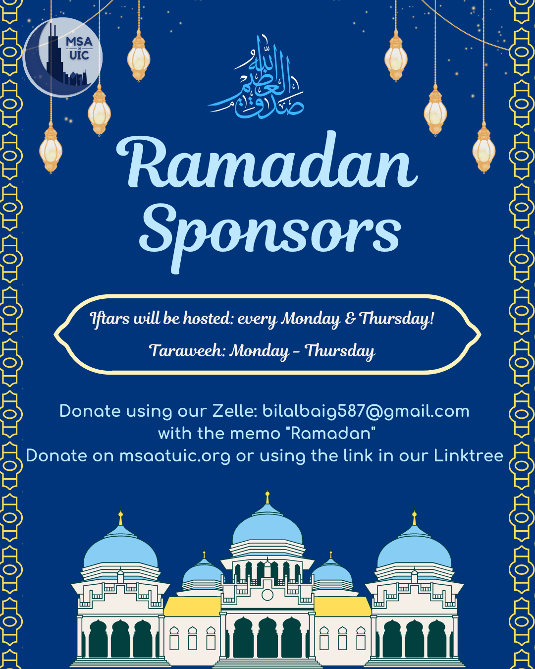 Every year the MSA at UIC receives hundreds of donations to hold two Iftars per week during Ramadhan. This is to support Iftars for the Muslim Community in the Chicagoland area & that attend the University of Illinois at Chicago!